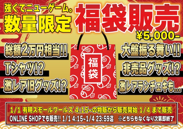 【数量限定】強くてニューゲーム。福袋販売!! 総額2万円相当!!!!! もうゲットできない過去のお宝グッズが入ってる!! 10000%5000円以上の価値ありです!! 価格:¥5,000- 期間:1/1 4:15-1/4 23:59迄 ※なくなり次第即終了